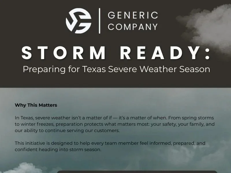 This internal infographic helps employees stay connected and prepared during Texas storm season by outlining key communication and preparedness steps.