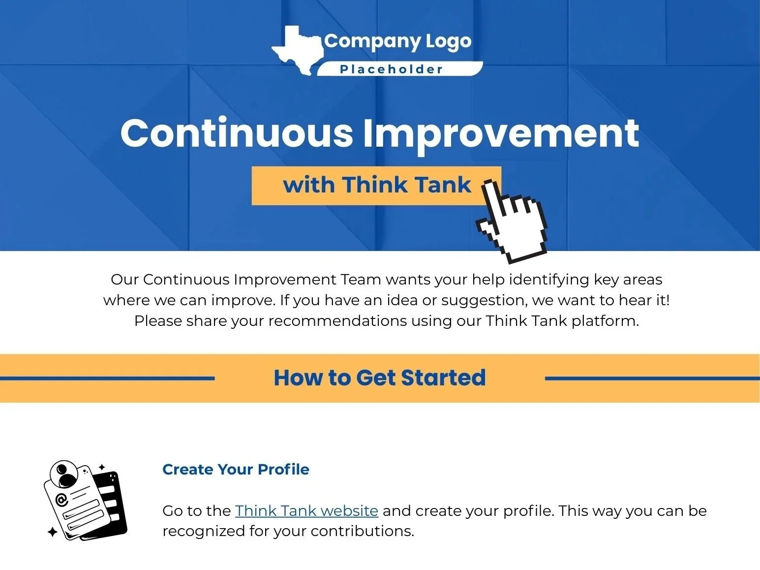 This internal communication introduces the company’s new suggestion platform, Think Tank, and guides employees on how and where to submit ideas, supporting the Kaizen team’s continuous improvement efforts
